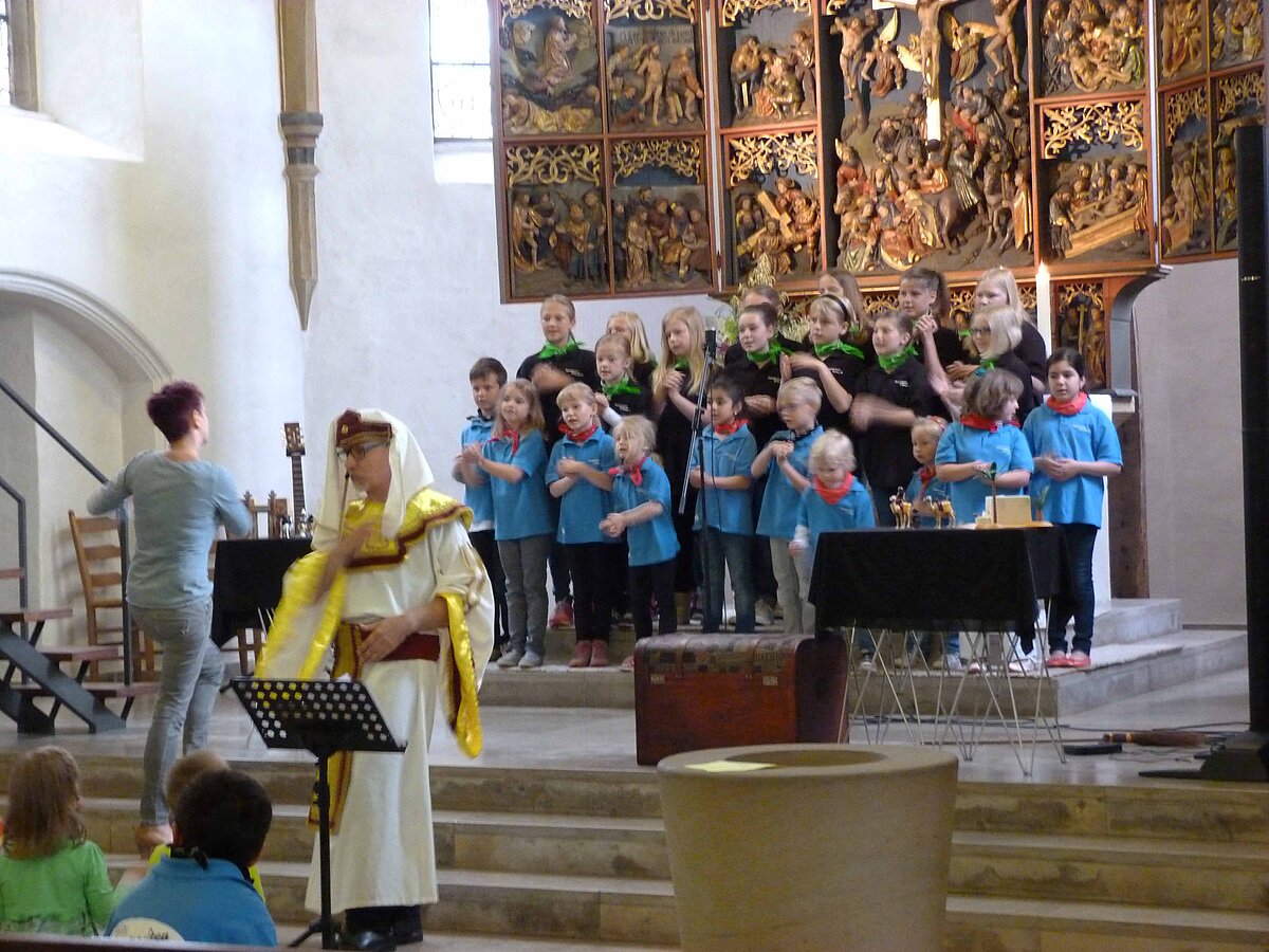 Uwe Lal begeisterte wieder einmal sowohl die Kinder als auch die Erwachsenen mit eingängigen Liedern, Bewegungen und Texten. Sein Singspiel "Die kostbare Perle" - musikalisch begeisternd begleitet von den "Notenkaoten" (Leitung Sandra Niermann) regte spontan die Kinder zum Mitmachen und die Erwachsenen zum Nachdenken an. Auch der ev. Kindergarten hatte seinen besonderen Auftritt mit der Vorführung über den "weißen Schmetterling". Farbenprächtige Kostüme und eine liebevolle Choreografie (Leitung Christine Limberg) hielten Kinder und Erwachsenen in ihrem Bann.
