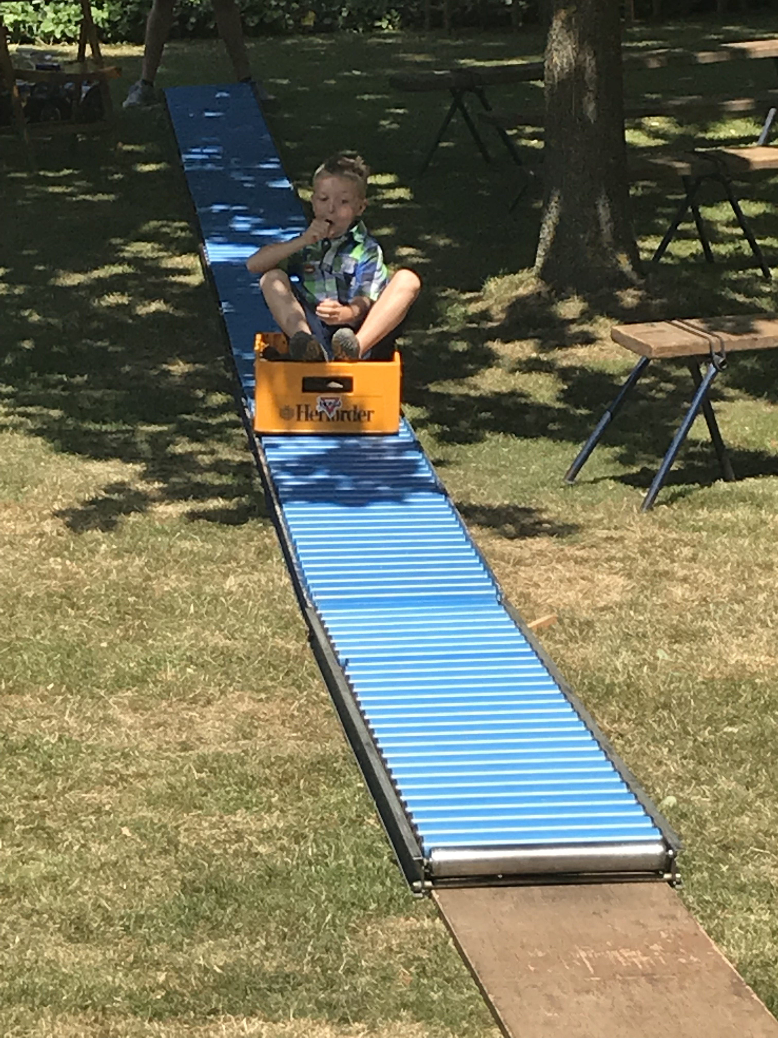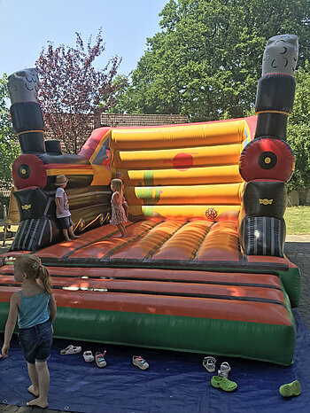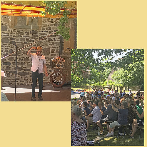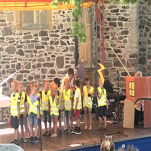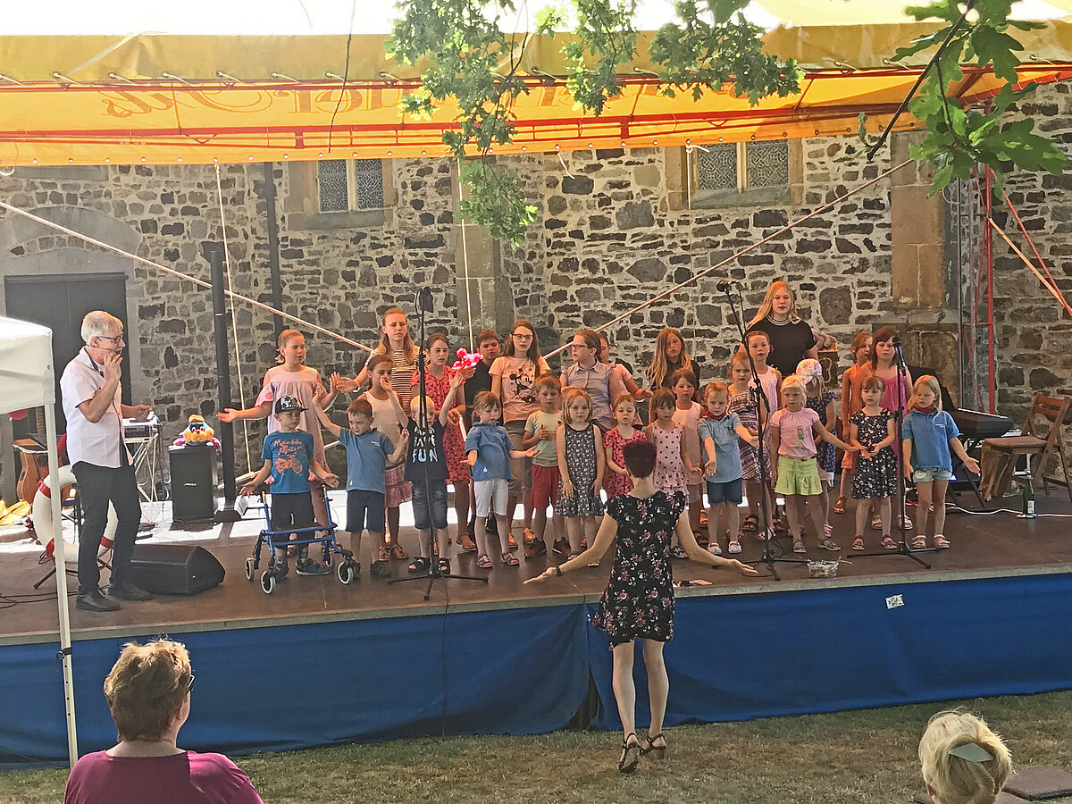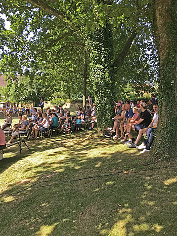 Bei bestem Wetter aber hohen Temperaturen fand am Sonntag (30.6.2019) der Familiengottesdienst untern den Bäumen vor der Bartholomäuskirche statt. Die aufgestellten Bänke waren voll besetzt und die Temperaturen unter den Schatten spendenden Bäumen gut erträglich. Pfarrer Gerhard Tebbe leitete den Gottesdienst. Er wurde dabei begleitet von Uwe Lal, dem Kindergarten Schwenningdorf und den Notenkaoten. Das Thema, das Uwe Lal zusammen mit den Notekaoten zelebrierte, lautete: "Voll im Wind". Auch die Gottesdienstbesucher wurden zum Mitgestalten einbezogen. Der Kindergarten Schwenningdorf führte ein Spiel zum Thema des 23. Psalms auf. Im Anschluss an den Gottesdienst, in dem auch eine Taufe durchgeführt wurde, traf man sich zu Gesprächen bei Getränken, Kuchen, Bratwurst und Eis aber auch an einer Kistenrutschbahn und einer großen Hüpfburg, die viel Freude bereitete.