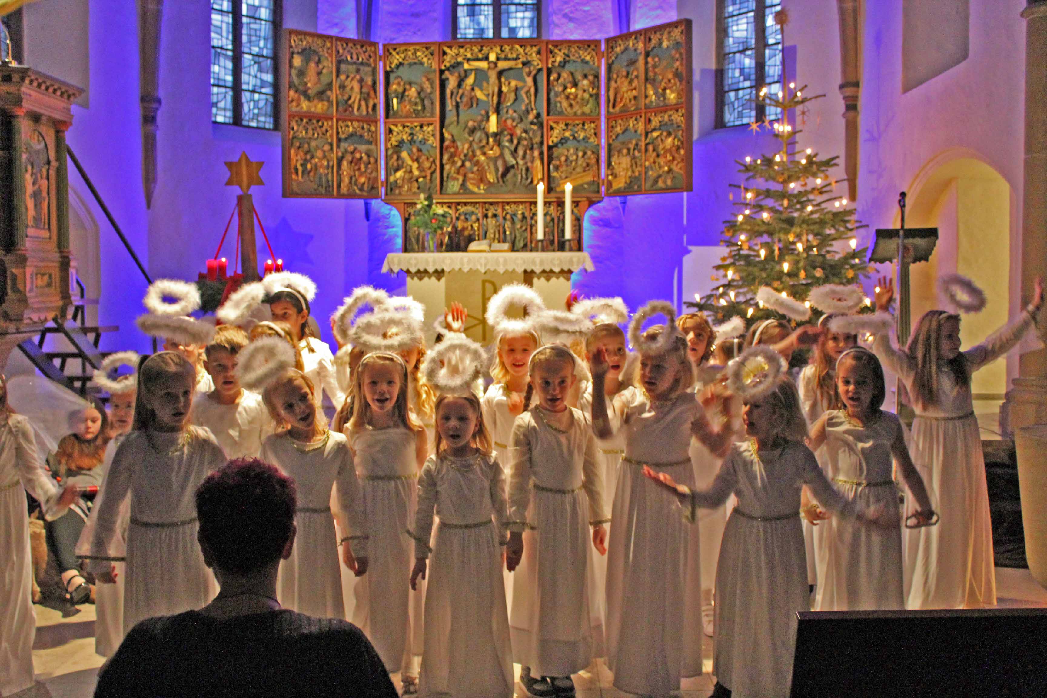 Mit einem neuen Krippenspiel „Der Engel und die Weihnachtsbotschaft“ präsentierten Miriam Patzelt und Sandra Niermann mit ihren „Notenkaoten“ ein beeindruckendes Krippenspiel. Wunderbare Gruppenauftritte und eindrucksvolle Solopartien dieses besonderen Kinderchores brachten zusammen mit den wunderschönen Kostümen eine herrliche weihnachtliche Stimmung in die Bartholomäuskirche, die Jung und Alt faszinierten.