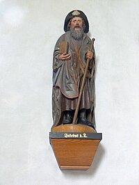 Jakobus ist mit Pilgerstab, Reisetasche und Pilgerhut mit Muschel zu sehen. Jakobus war Sohn des Fischers Zebedäus und seiner Frau Salome von Galiläa aus Bethsaida am See Genezareth. Zusammen mit seinem Bruder, dem Evangelisten Johannes, folgten sie Jesus nach. Er ist im Jahr 44 von Herodes Agrippa I durch das Schwert hingerichtet worden. Sein Grab ist der Kathedrale von Santiago de Compostella. Er wird auch als Nationalheiliger und Patron Spaniens und Portugals verehrt.