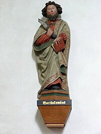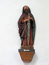 Als Saul wurde er um 10 in Tarsus (Südtürkei) geboren. Die Familie war streng jüdisch und besaß das römische Bürgerrecht. Sein Handwerk war Grobweber und die Zeltherstellung. 30-35 Studium der Thora an der Tempelakademie in Jerusalem. Vor den Toren von Damaskus zum Paulus bekehrt. (Damaskuserlebnis) Unter der Leitung des Petrus war er auch beim ersten Apostelkonzil(50-51) in Jerusalem dabei. Verhaftung im Jahr 59 und Inhaftierung in Caeserea bis 61, danach Überstellung nach Rom. Bei der Christenverfolgung Nero 64 zusammen mit Petrus hingerichtet. Paulus wird dargesteilt als Prediger mit einem Buch in der rechten Hand und einem Schwert in der linken. Über dem Hinrichtungsplatz südlich Roms steht heute die Kirche " Tre Fontane". Sein Grab befindet sich in der Kirche "San Paolo fuori le mura". (San Paulo vor den Mauern)
