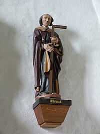 Er ist als "ungläubiger Thomas" aus der Bibel bekannt. "Weil du mich gesehen hast glaubst du. Selig sind, die nicht sehen und doch glauben" Joh. 20.24. Er war Baumeister, daher das Winkelmaß. Er missionierte in Indien, und erlitt sein Martyrium im Jahre 72 in der Nähe des heutigen Madras.