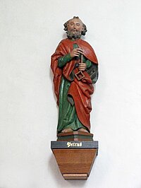 Simon war sein eigentlicher Name, Sohn des Fischers Johannes aus Bethsaida am See Genezareth. Er war erster Bischof von Rom (gest. um 64), beigesetzt in einem Erdgrab unter dem Petersdom. (Aussage archäologischer Untersuchungen von 1940-1949). Petrus bedeutet Fels. Er gehörte mit Johannes dem Evangelisten und Jakobus dem Älteren zu den Vertrauten Jesu. Er wird mit dem Schlüssel dargestellt, da er die Schlüssel des Himmels von Jesu bekommen hat.