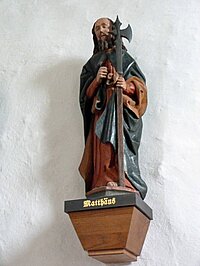Er war derjenige Jünger, den das Los bestimmte, den Platz als Apostel des Judas Iskarioth einzunehmen, der sich das Leben genommen hatte. Er missionierte in Äthiopien wo er im Jahre 63 gesteinigt und mit dem Beil erschlagen wurde. Kaiserin Helena brachte die Gebeine nach Trier, das 293-395 Hauptstadt des Weströmischen Reiches war. Es ist das einzige Apostelgrab auf deutschem Boden. Matthäus' Gebeine ruhen heute in der Benediktiner Abtei in Trier.