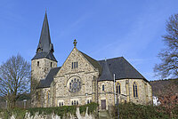 Dessen Fundamente tauchten bei den Ausgrabungen im Jahr 1962 auf; und sie bildeten einen der Hauptgegenstände dieser Grabung. Von den Archäologen wird dieser - zweite - Steinbau auf das 12. Jahrhundert datieren. Der querrechteckige Chorraumes dieser Kirche hatte die lichten Maßen von 4 m Länge und 5,5 m Breite. Das dazu gehörende Kirchenschiff selber war 7,20 m breit und 15,70 m lang. Zu dieser Saalkirche rechnen die Archäologen auch den viergeschossigen Westturm. Am Turm sind auch heute noch die folgenden romanischen Baumerkmale zu erkennen: In der Nord- und der Südseite des Turms befinden sich jeweils ein - vermauertes - rundbogiges Fenster. Von einem folgenden Zwischengeschoss waren eine breite Öffnung nach Osten und zwei kleine Fenster in der Nord- bzw. Südwand vermauert. Die breite Öffnung entsprach dem Zugang zum Dachraum der mit einer Holzdecke ausgestatteten Kirche. Das letzte darüber liegende Geschoss besaß im Osten zwei kleine Arkaden, im Norden und Süden je eine Arkade ohne Teilungssäulchen.