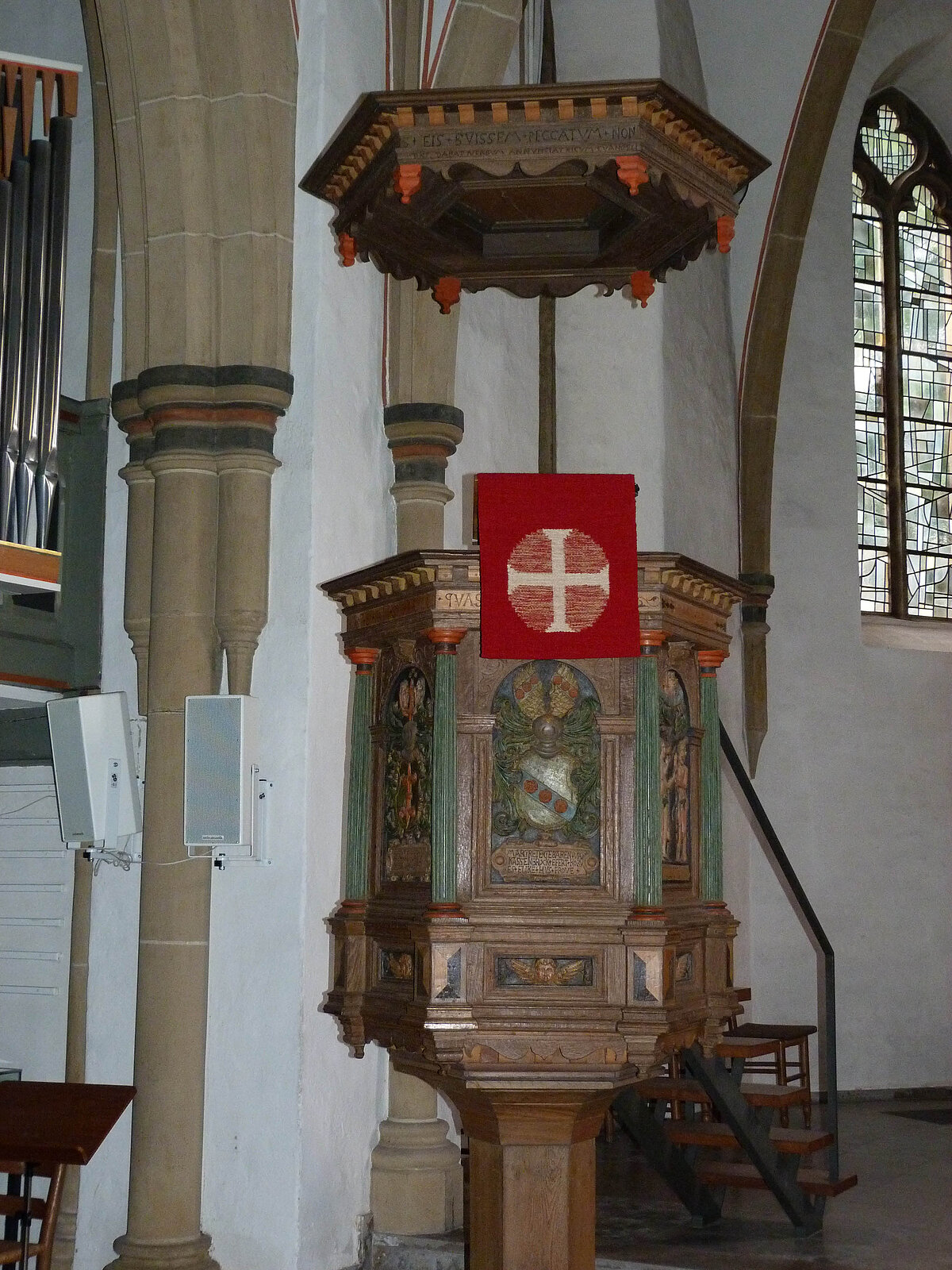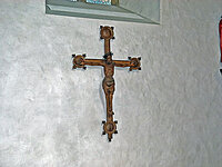 Aus der Mitte des 18. Jahrhunderts stammt ein Allianzwappen, das der südlichen Querhaus-Ostwand angebracht ist. Links steht das Wappen von Sophie Henriette v. Treskow, rechts das von ihrem Mann Dietrich Heinrich v. Korff. Die beiden heirateten 1728; sie verstarb 1756, und er 1766. Sie trägt in ihrem Wappen im Schild drei rechts gekehrte Vogelköpfe mit Halsband. Sein Wappen enthält im Schild die Korff'sche Lilie, auf dem Helm einen Wulst, darüber wiederholt sich die Lilie, die von zwei Meerjungfern mit Fischschwänzen und Flossen gehalten wird.